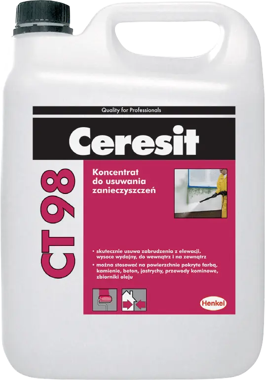 Ceresit CT 98 permet de nettoyer et dégraisser les façades très sales des bâtiments construits en technologie ETICS, finies avec des enduits minéraux, acryliques, silicatés, silicones ou silicate-silicone.